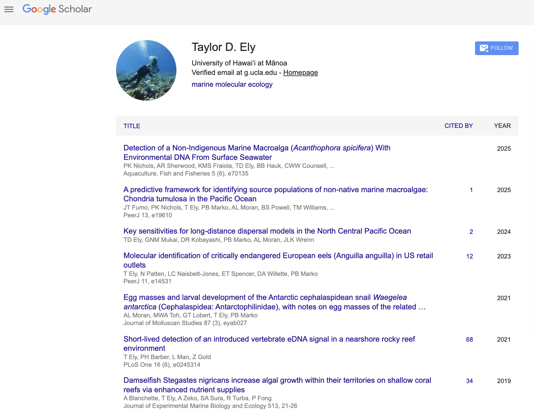 Hi! I am a PhD candidate at the University of Hawaiʻi at Mānoa in the zoology program. I am interested in connectivity of marine species across the Central North Pacific Ocean. I use both environmental DNA (eDNA) methods and simulation of larval dispersal to investigate these patterns of connectivity and isolation.